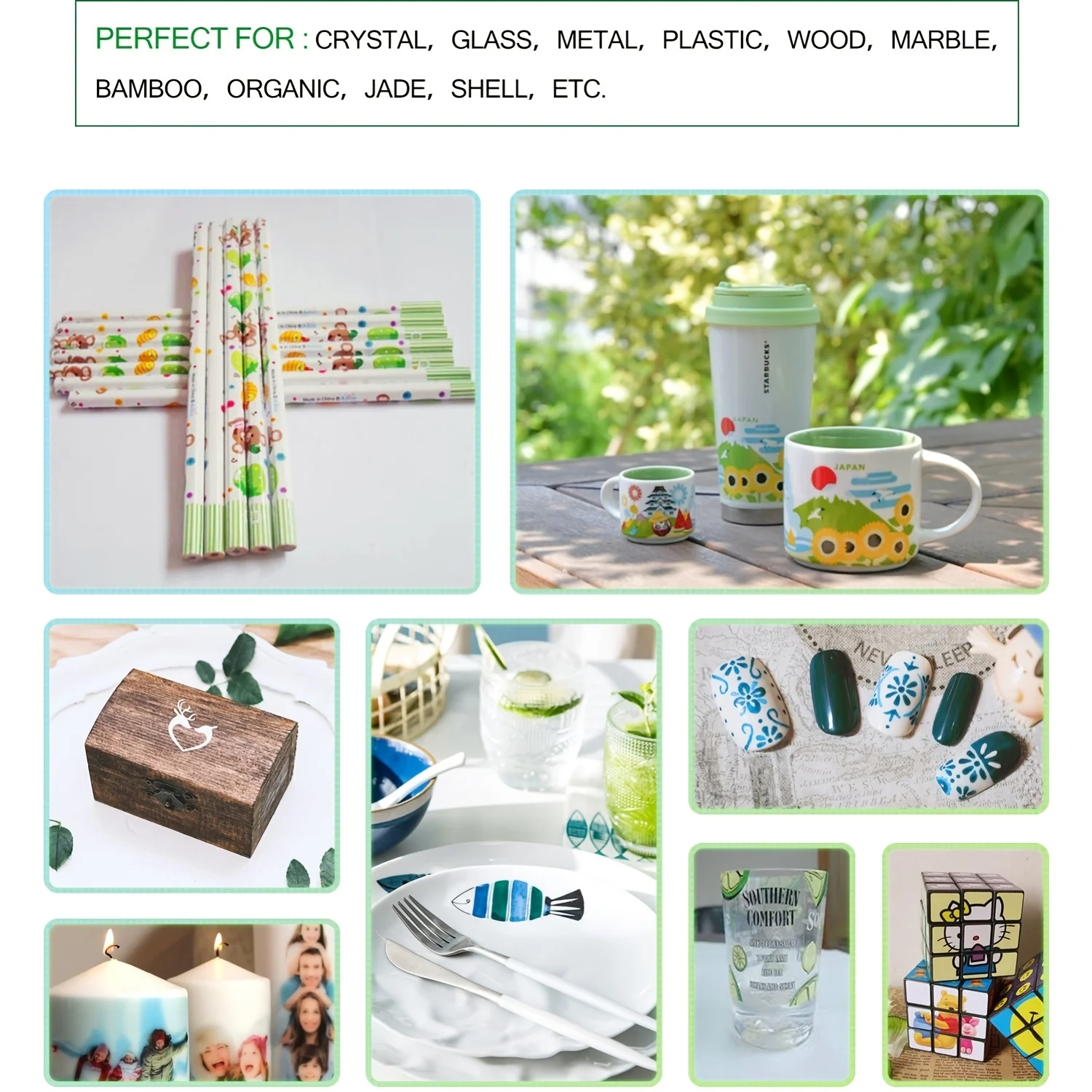 They are widely used for organic, wood, marble, plastic, bamboo, metal, jade, glass, shell, crystal, flowers, ceramics, mug, plate, candle etc