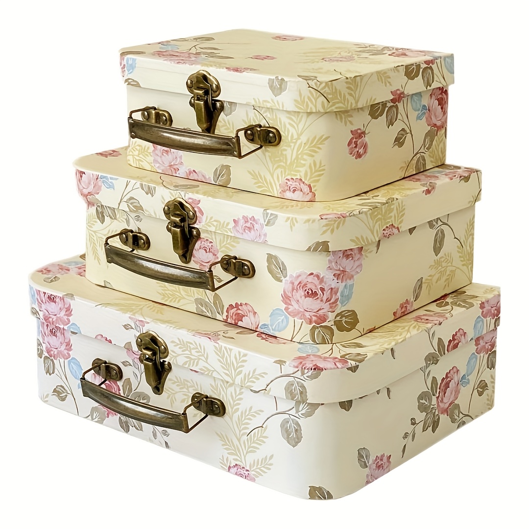 3pcs Floral Paperboard Suitcase Storage Boxes with Lids – Pink Rose Design, Golden Handles, Multi-Purpose Organizer for Photos, Gifts, and Home Decor, Perfect for Christmas, Weddings, Birthdays, and Anniversaries, Gift Storage | Decorative Storage | Easycare Material, Decorative Boxes