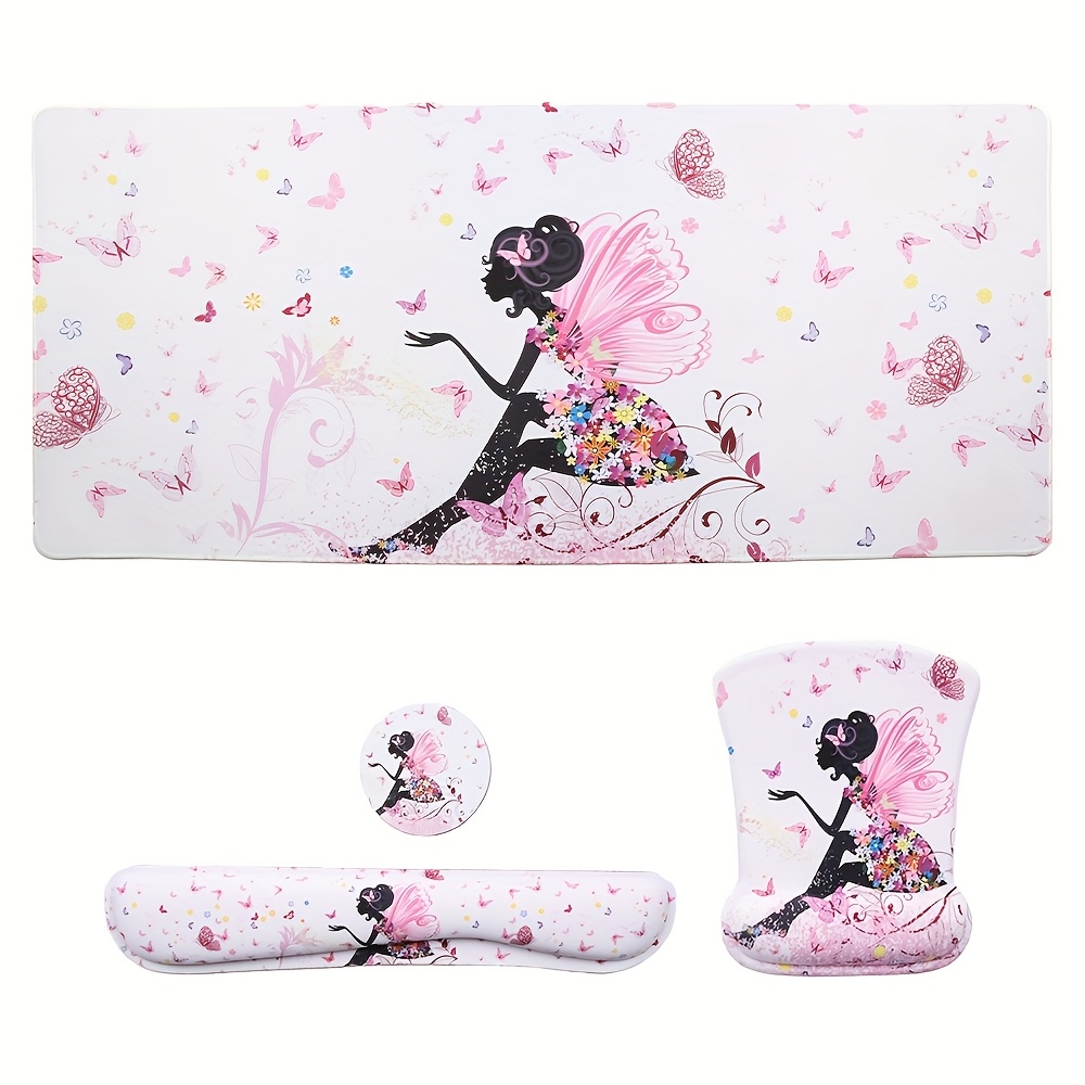 4 in 1 Keyboard and Mouse Pad, Extended Mouse Pad with Stitched Edges, Mouse Pad and Keyboard Wrist Rest, Smooth Gaming Mouse Pads, Keyboard Mats for Desk, Pink and Butterfly Gir
