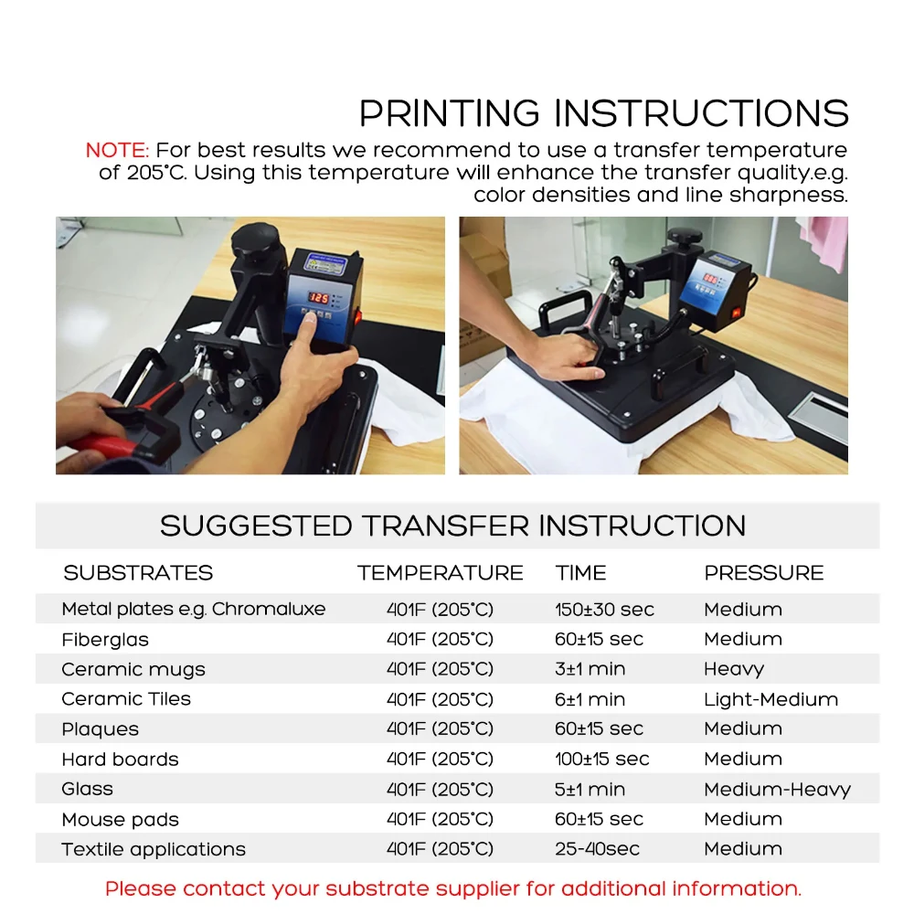 NOTE: For best results we recommend to use a transfer temperature of 205°C. Using this temperature will enhance the transfer quality.e.g. color densities and line sharpness.