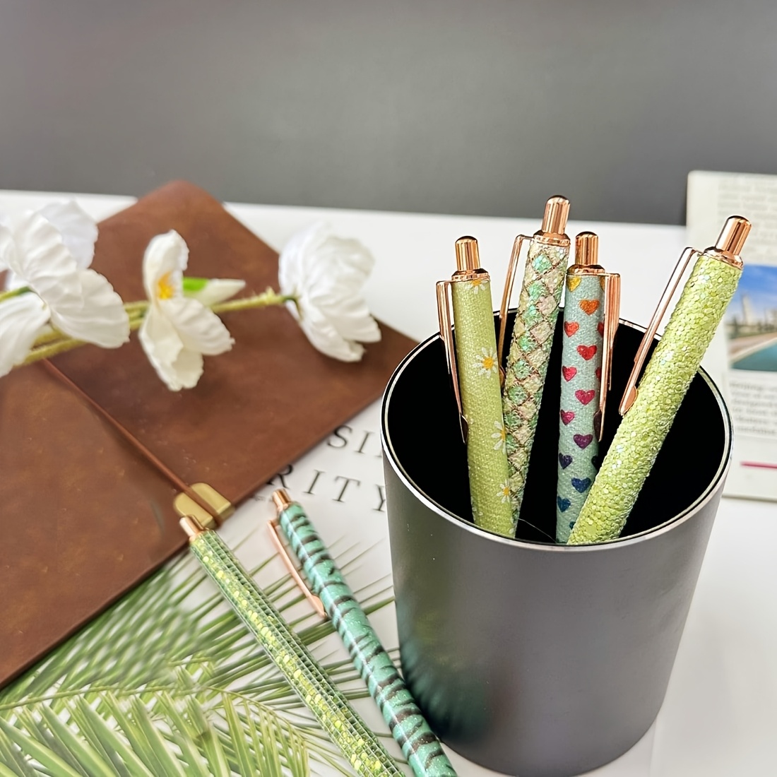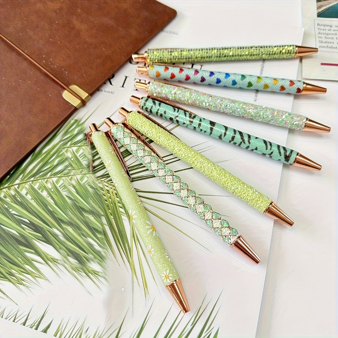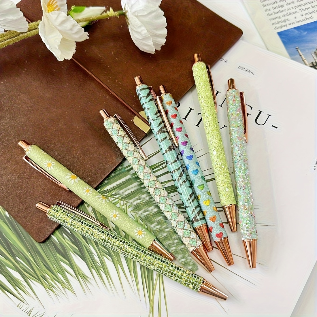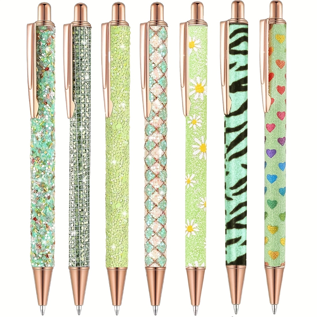 7pcs Green Fancy Pen Set, Ballpoint Pen, Sparkly Glitter Pens for Women, Writing Pen Retractable Fancy Pens, Diverse Styles for Office Supplies, Fine Writing Instrumen