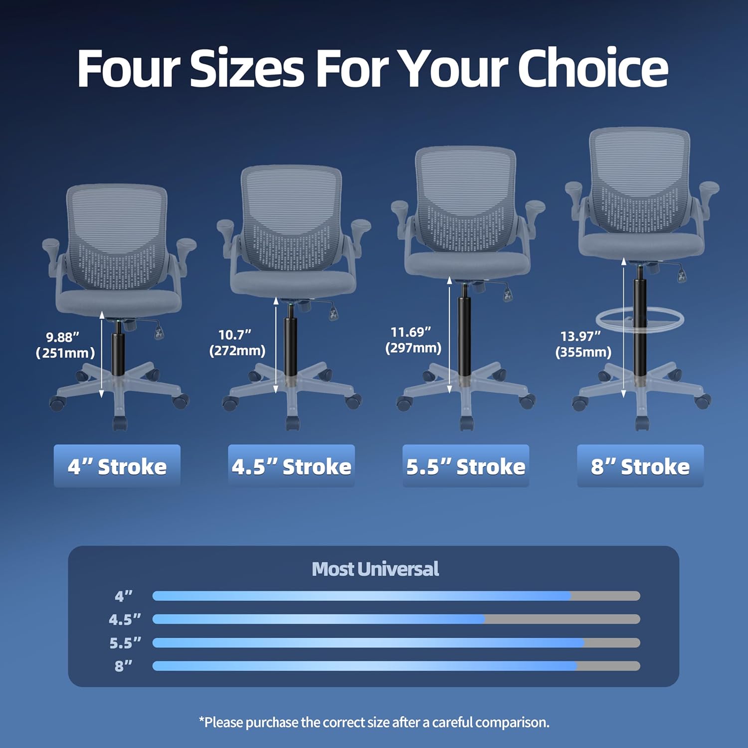 🏆【Adjustable Height 4 inches】The compressed length is 9.88 inches (251mm), the fully expanded length is 13.6 inches (346mm), sinking length is 1/2” (15mm), Stroke Length is 3.7 inches, which allows your chairs to rise higher. (Note: Please measure the length of the outer cylinder before purchase).