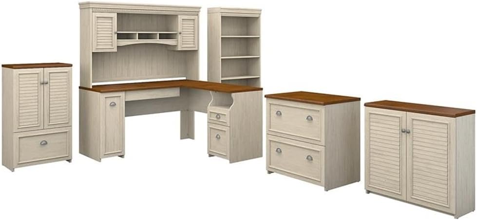 Bundle includes: 60W L Shaped Desk with Storage, 60W Hutch for L Shaped Desk, 2 Drawer Lateral File Cabinet, Tall 5 Shelf Bookcase, Small Storage Cabinet with Doors, 2 Door Storage Cabinet with File Drawer