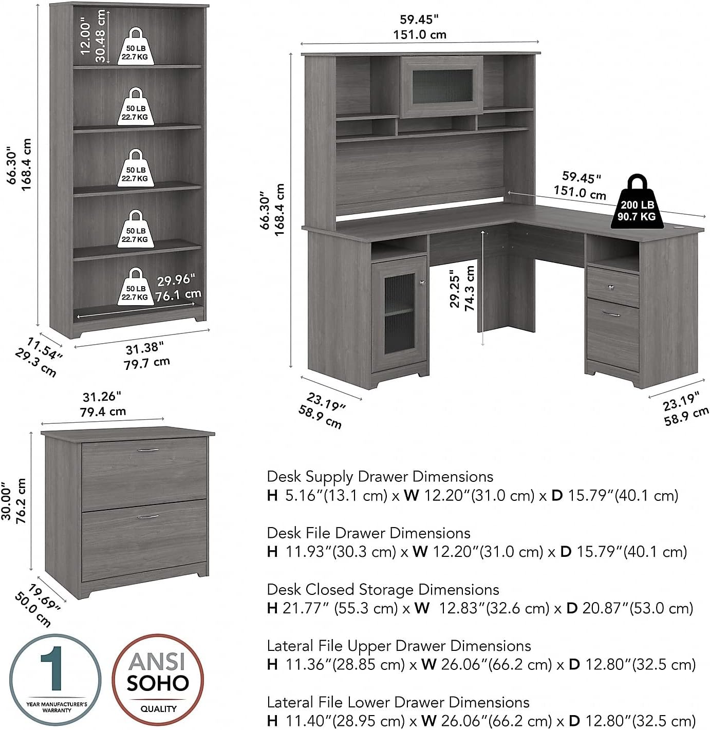WE’VE GOT YOU COVERED: Our L shaped office desk with hutch and lateral filing cabinet is backed by a 1-year warranty. When you call or email Bush Furniture, you’ll talk to a customer service professional right here in Jamestown, NY, which is good to know!