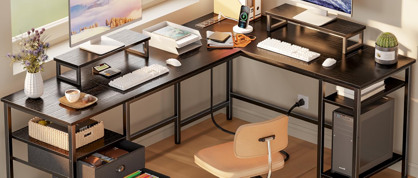 Upgraded Fabric File Drawer: The l shaped desk with a fabric drawer and file cabinet, 2 tier storage shelves, allowing you hold letter/A4/ legal size files. Drawers made of high-quality non-woven fabric that is lightweight, breathable and prevent dust.