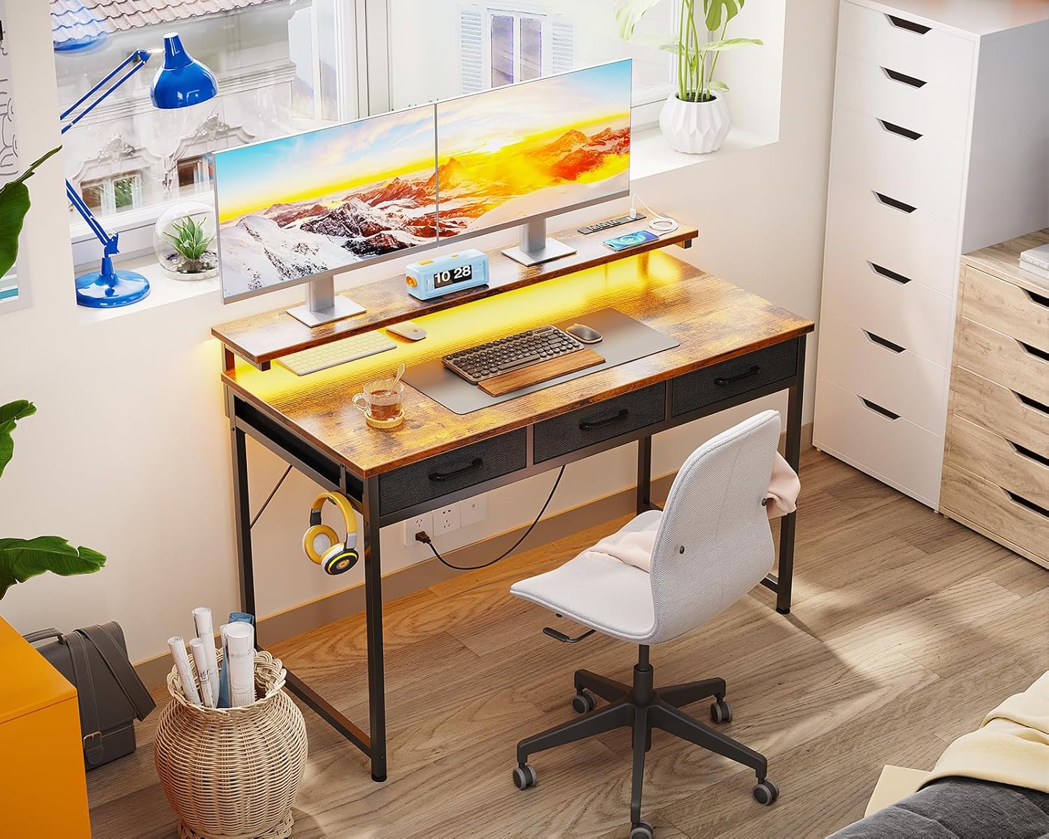 【Desk with Drawers & Monitor Stand】The home office desk has 3 large capacity fabric drawers, keeping your office or study supplies in order and dust-free. The 3-gear monitor stand (3.2″、4.3″、5.5″) provides an ergonomic view angle for people of different heights in different use environments. The monitor stand is also removable without screw holes left on the desktop.