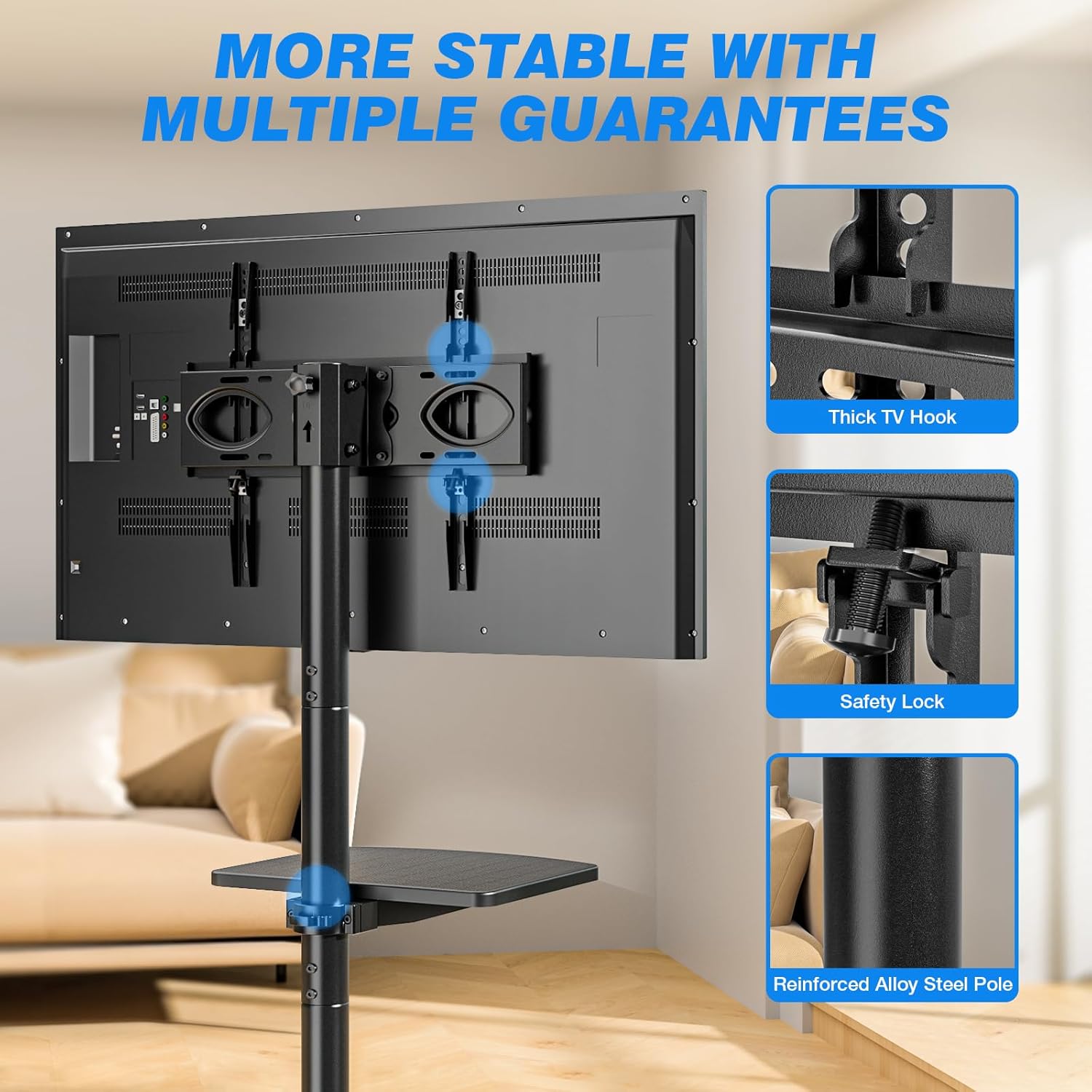 ULTRA-STRONG MOBILE TV STAND: The high-strength alloy steel construction enhances overall stability and load-bearing capacity. Our portable floor TV stand securely holds up to 88 lbs—surpassing competitors’ 55-lb capacities—thanks to its reinforced structure. The thickened mount resists tipping, while safety screws provide additional protection. Trust Rfiver’s Rolling TV Cart to safeguard your TV from falls.