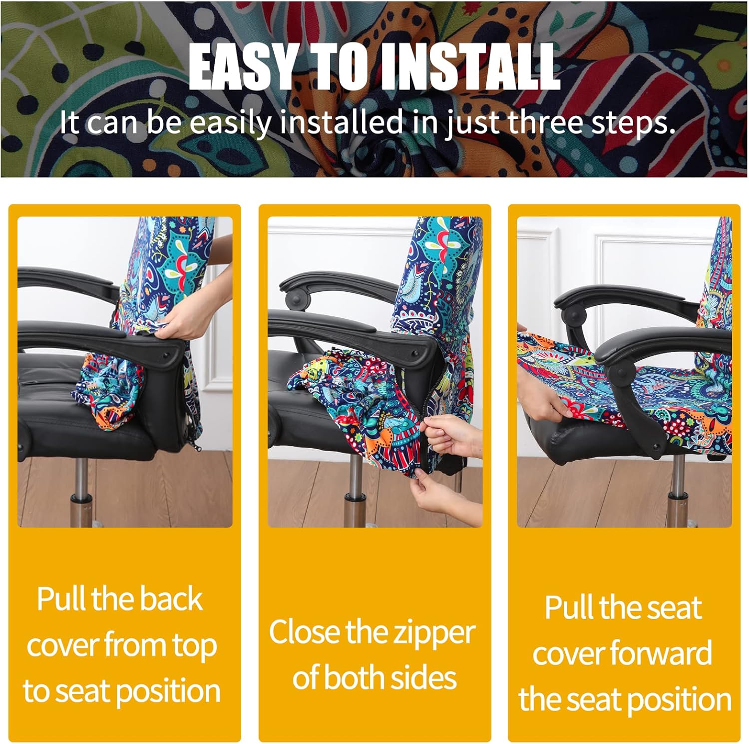 SUITABLE FOR CHAIR SIZE – Printed office chair slipcovers will fit chair back’s height: 27.5-31.5 inches, chair back’s width: 17.7-22.8 inches, chair seat length: 17.7-22.8 inches, chair seat width: 17.7-23.7 inches. Please refer to the measuring guide in pictures to measure your office chair size.