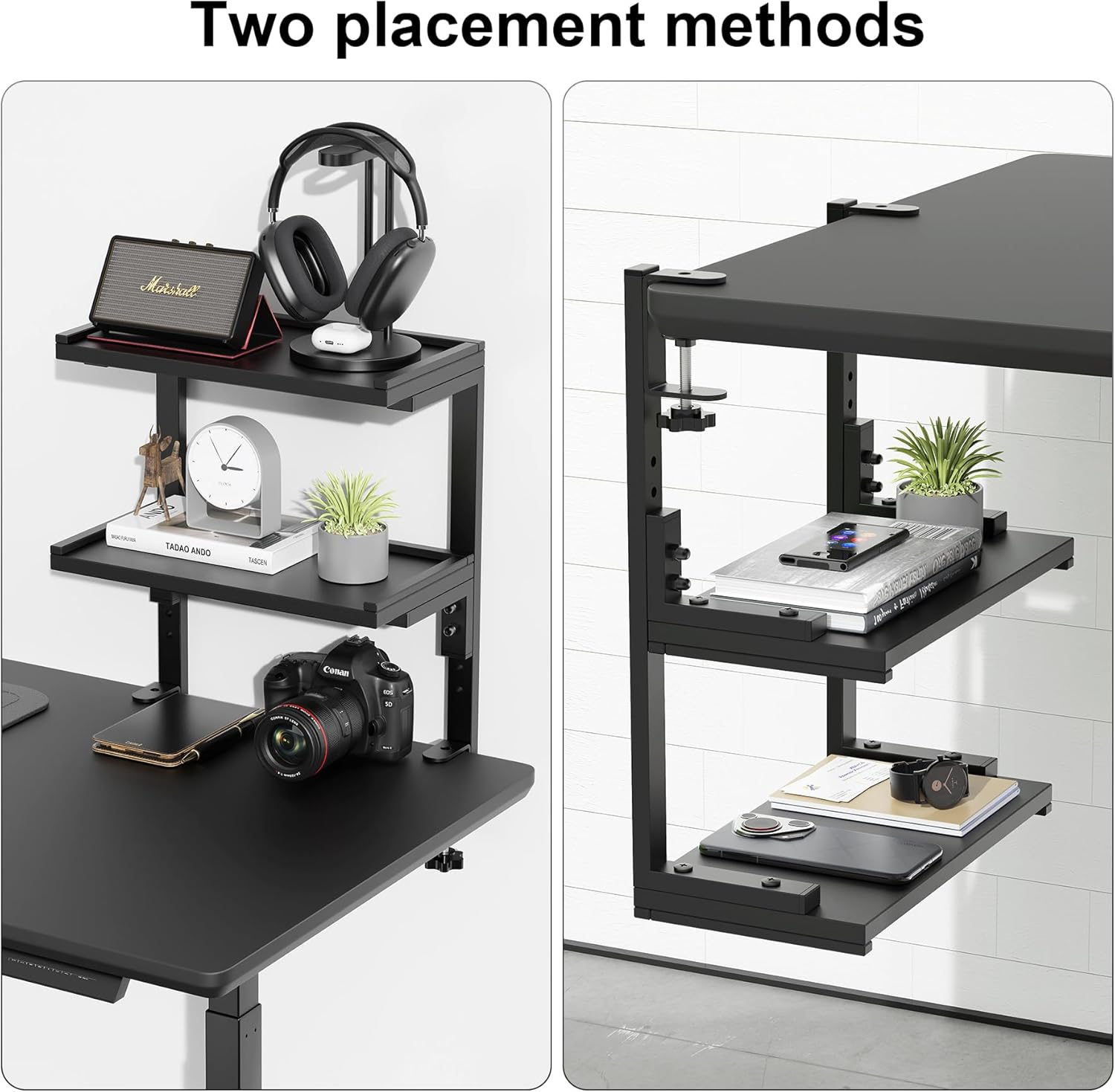 【Versatile Installation】: Our desktop organizer can be used upside down and can be easily placed anywhere above or below the desk. The height of the lower shelf is adjustable to maximize its function to meet your needs.