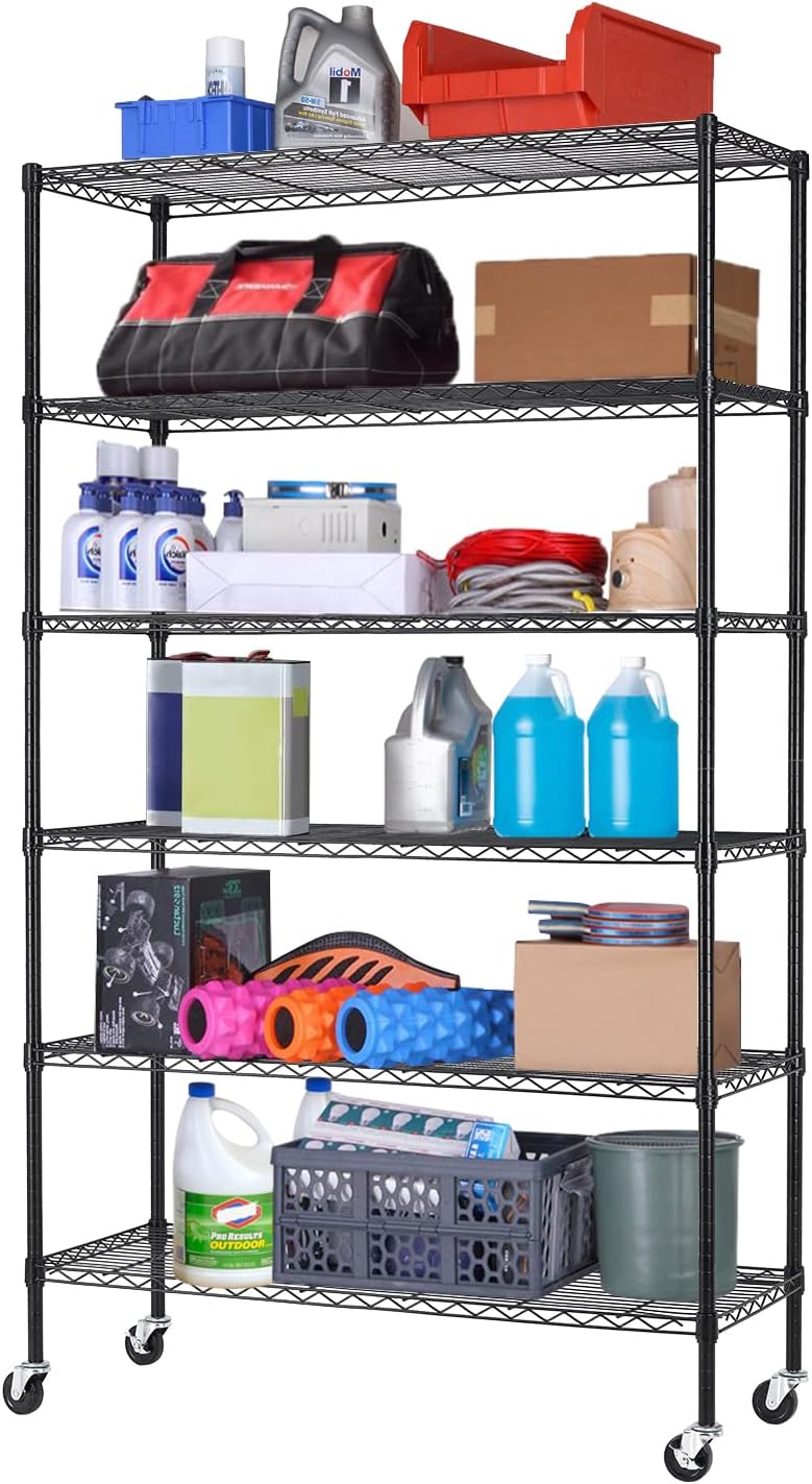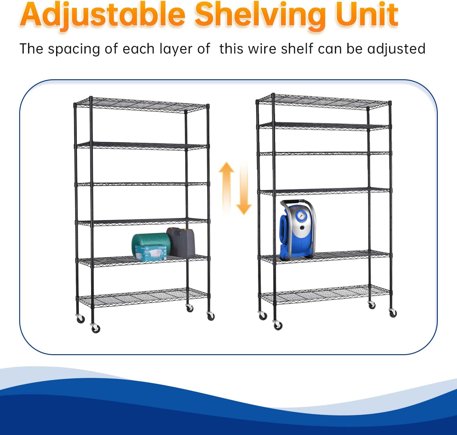 Best Shelves: A–Bonus 4″ Wheels + Leveling Feet – Includes smooth-rolling caster wheels (2 locking) for easy positioning in your garage, office, warehouse, workshop . B–storage shelf is a very tall unit 82″H with wheels, metal Rack has a lot of storage space which is what you need for your kitchen, Garage, restaurant. WARNING: CHOKING HAZARD — Small parts. Not for children under 3 yrsmercial-Grade Shelving: ✔Storage shelf’s layer can be set at any height for your individual needs. ✔Metal rack could accommodate a variety of items. ✔Wire shelving Unit have helped in organizing garage, kitchen, office and so on. NSF-Certified Metal Wire Shelving: The steel wire of the storage shelf is very durable, so it can hold a lot of things. The total weight limit of the whole shelf is 2100 pounds when equally distributed on feet levelers. Weight limit of each Wire Shelving is 350 pounds when equally distributed on feet levelers. Maximum entire unit weight capacity is 500lbs when equally distributed on casters. Dimensions: 48″L x 18″W x78″H (With stationary feet) Dimensions: 48″L x 18″W x82″H (With Wheels) storage shelf metal rack wire shelving unit wire shelves heavy duty with wheels 6 tier garage rack layer shelf for pantry kitchen black overall organizer unit durable steel wire layer shelf unit multipurpose unit storage rack