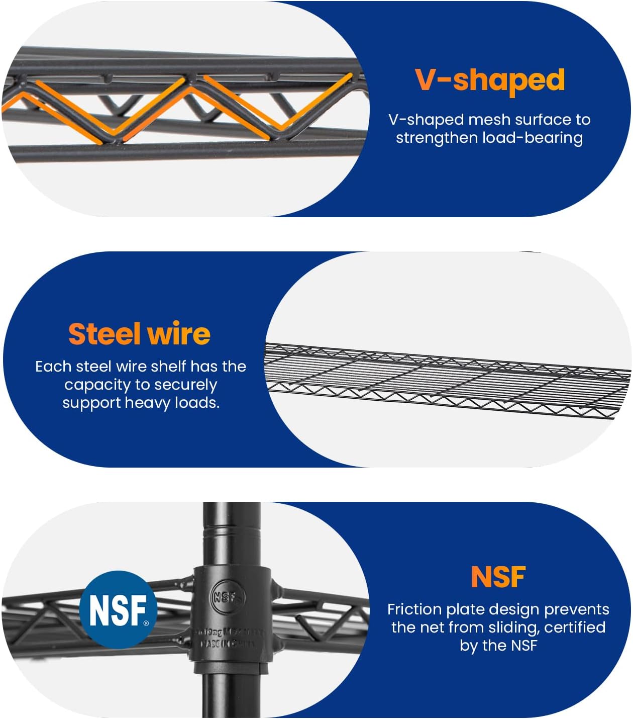 STURDY AND DURABLE – Constructed from heavy-duty steel wire, this shelf is durable and resistant to dirt buildup and corrosion. The total weight limit of the whole shelf is 2100 pounds when equally distributed on feet levelers.Maximum entire unit weight capacity is 500lbs when equally distributed on casters.