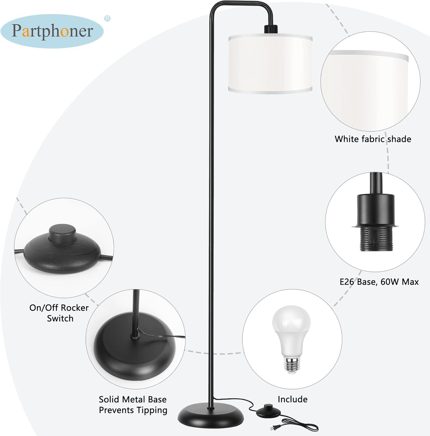 PARTPHONER Stylish & Modern 3 color temperature black floor lamp with white lampshade and foot switch tall pole floor reading lamp 9W led bulb include, provides soft and natural light for reading and working in your home or office.